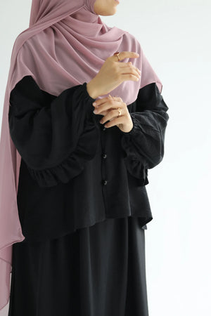 البلوزة تقدري تفتحيها وتلبسيها على جيب بليسيه أو بنطلون بيزك.